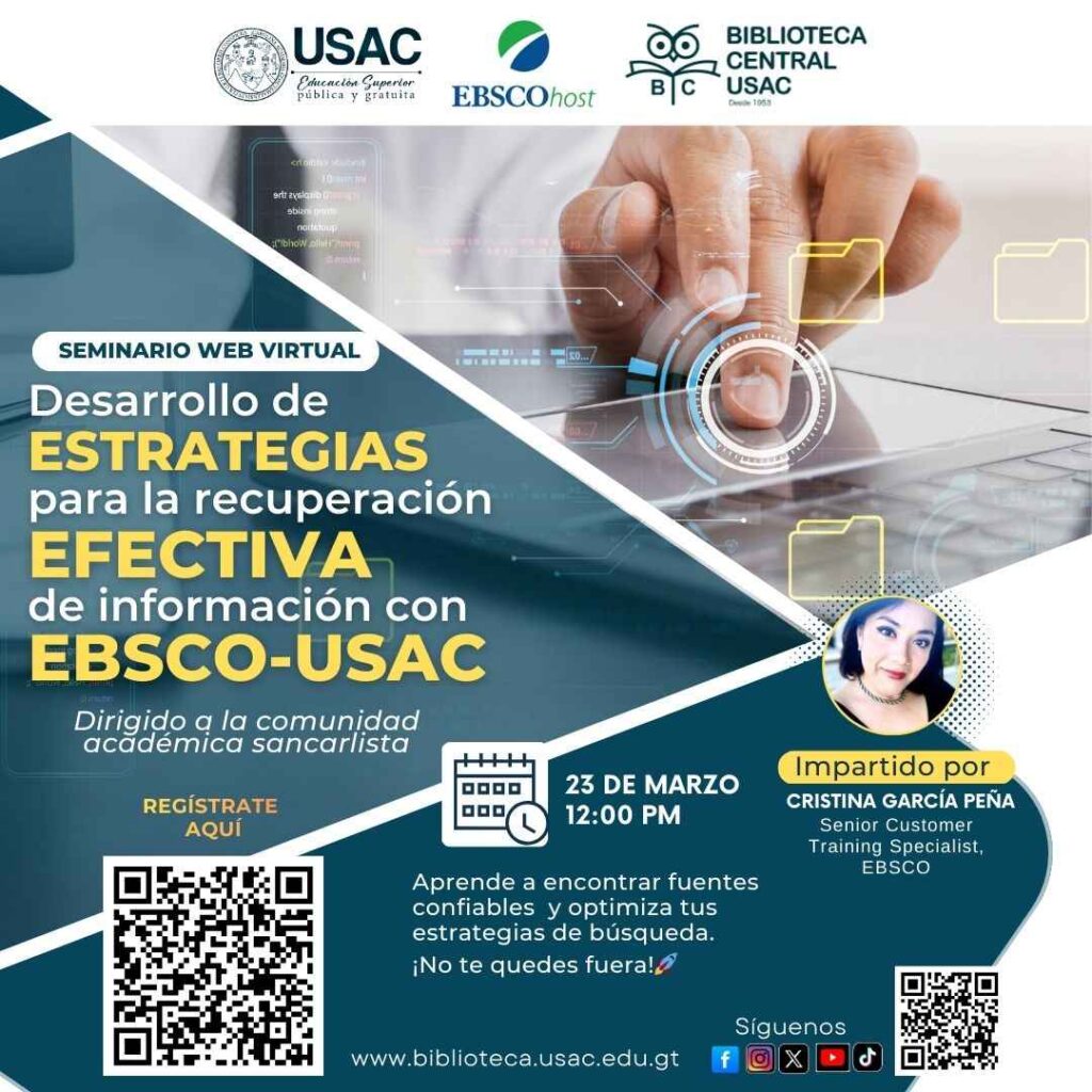 23 de marzo. La Universidad de San Carlos de Guatemala te invita a participar en el Seminario web virtual: “Desarrollo de estrategias para la recuperación efectiva de información con EBSCO-USAC”.