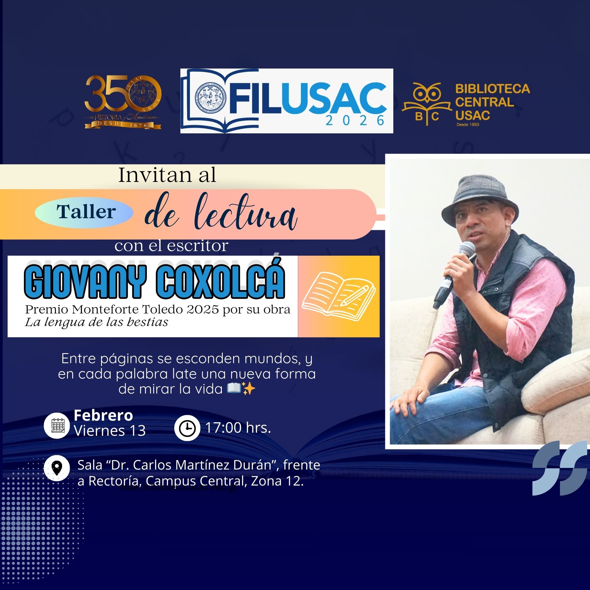 Viernes 13. Te invitamos a participar en el Taller de lectura, con el reconocido escritor Giovany Coxolcá, Premio Monteforte Toledo 2025 por su obra La lengua de las bestias. 🗓 Viernes 13 de febrero⏰ 17:00 horas📍 Sala “Dr. Carlos Martínez Durán” (Frente a Rectoría), Campus Central, Zona 12. Una oportunidad […]