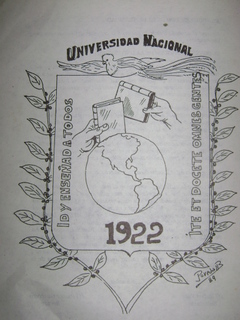 En el centro la esfera representado al mundo, con el que se quiere confraternizar por la cultura; sobre esta esfera, dos manos cambiándose libros, significando así que la comunicación de un pueblo con otros se hace por medio de la obra escrita; en derredor de estos símbolos un marco en el que aparecerá la siguiente leyenda: «ITE ET DOCETE OMNES GENTES» «ID Y ENSEÑAD A TODOS», frase en la que se sintetiza el objeto primordial de las Universidades. En la base del marco la fecha de 1922; sobre la parte superior, el quetzal, símbolo de la libertad y representativo de Guatemala, y sobre él, coronando el escudo el nombre de la UNIVERSIDAD NACIONAL. Todo el conjunto descansará sobre dos grandes ramas de cafeto, representación principal de la energía y del trabajo patrio.