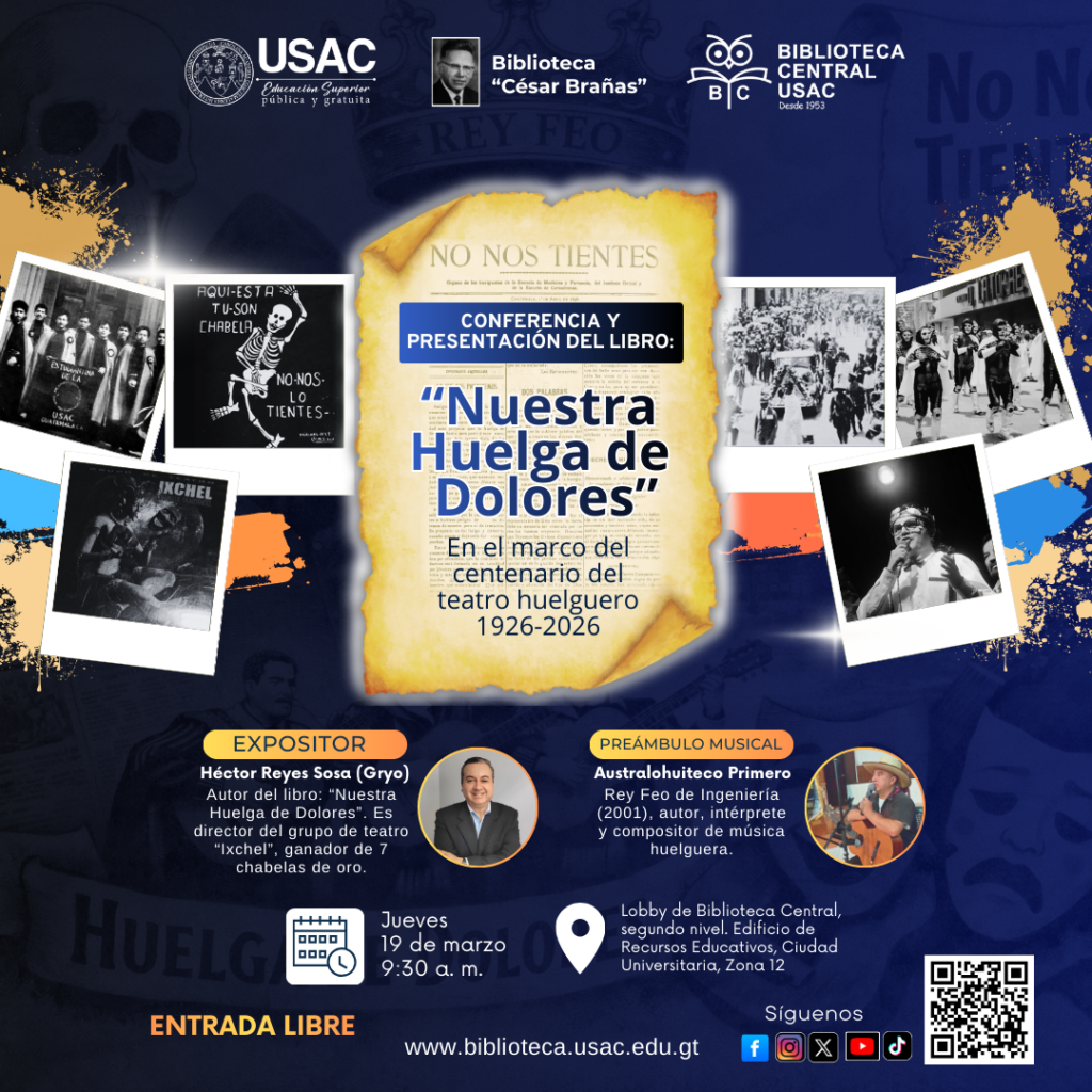 Jueves 19 de marzo. Cordial invitación a la comunidad sancarlista a participar en la conferencia y presentación del libro “Nuestra Huelga de Dolores”, del escritor y director del grupo de teatro “Ixchel” Héctor Reyes Sosa (Gryo), una obra que recorre la memoria y el espíritu de la tradicional Huelga de Dolores, en el marco del centenario del teatro huelguero universitario (1926-2026).